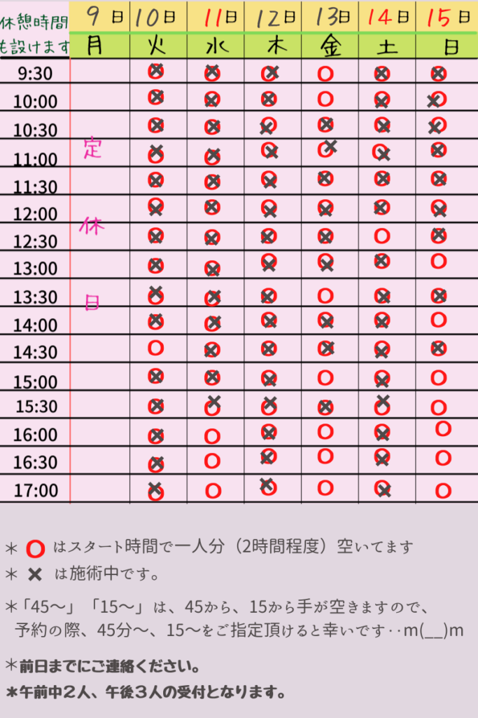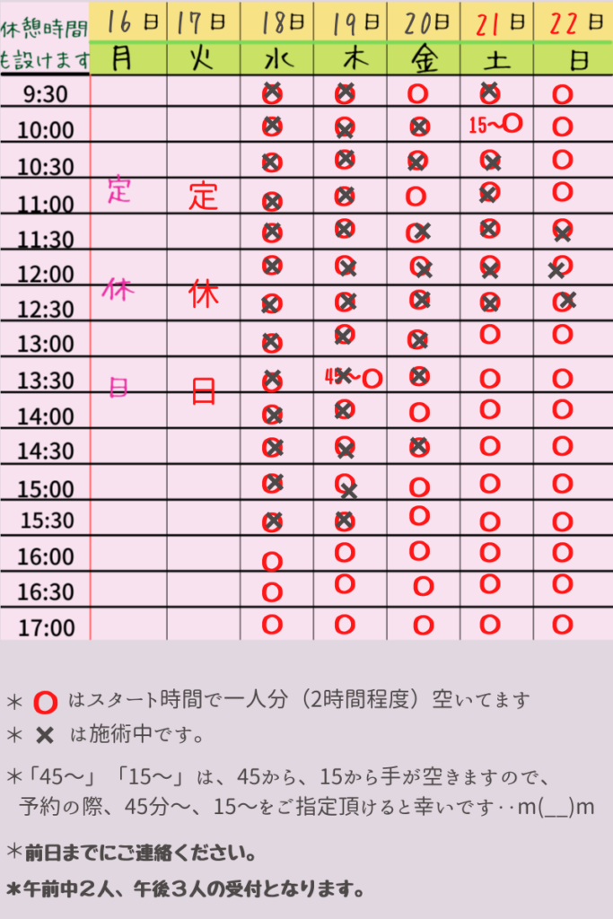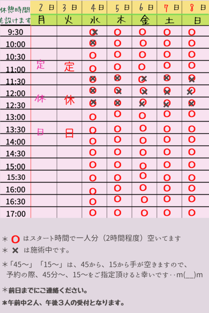 ⭐13日金曜日、3人分空いてます ◎メニューにより9:30~10:00、◎13:30~、◎15:00~ご予約お待ちしております