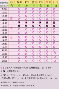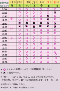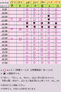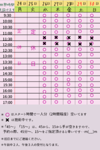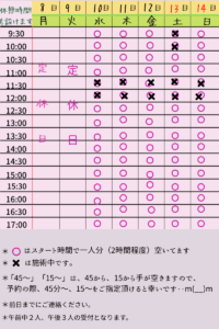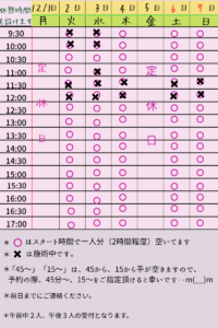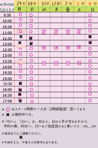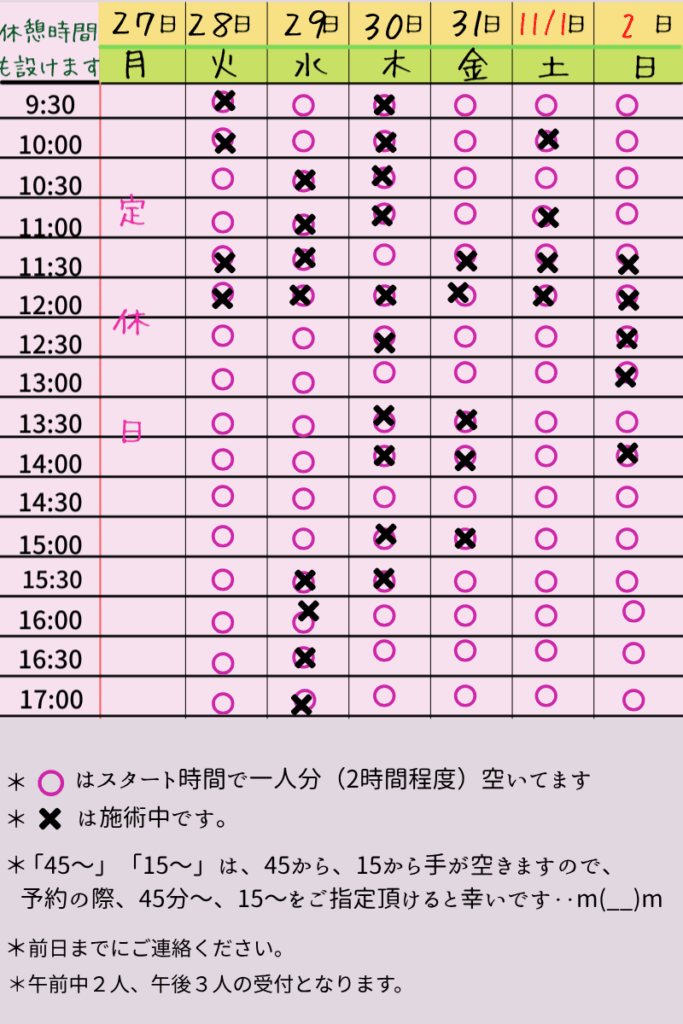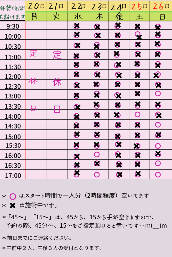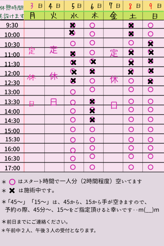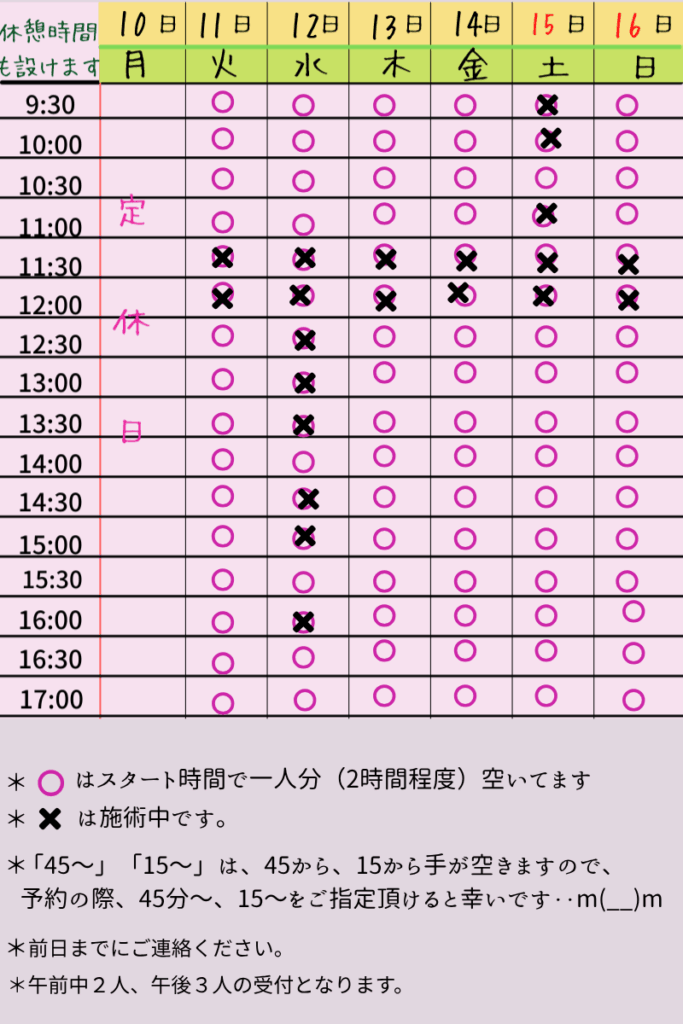 ⭐2日、日曜日、◎午前中、◎13:30~、◎14:30~、以降ご予約お待ちしております。