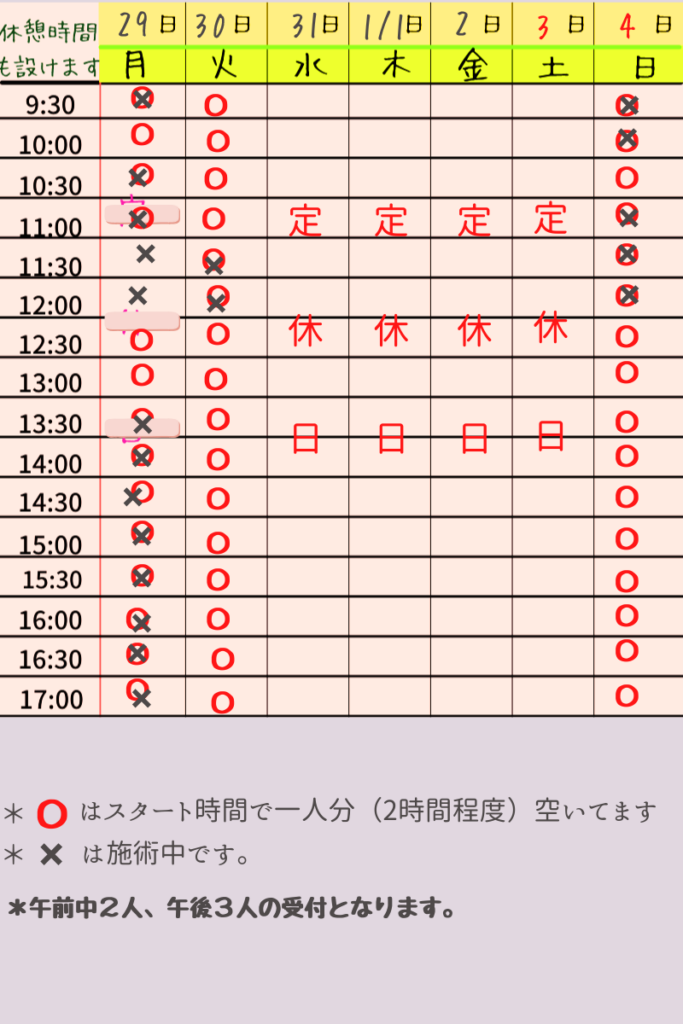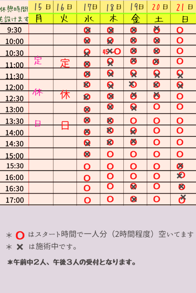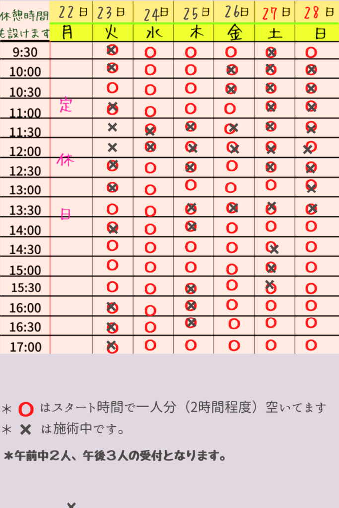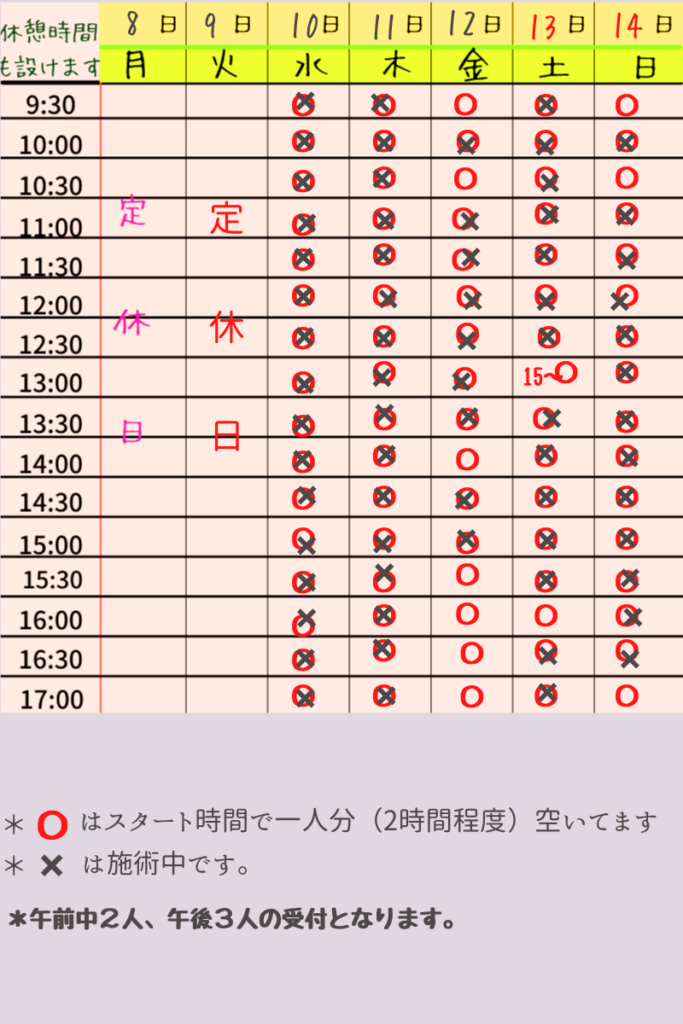 ⭐14日、日曜日、2人分空いてます ◎9:30~、◎10:30~、◎17:00~ ご予約お待ちしております。