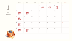 🌟定休日は2ヶ月前からカレンダーに示しています。毎週月曜日、他不定休(セミナー参加の為)